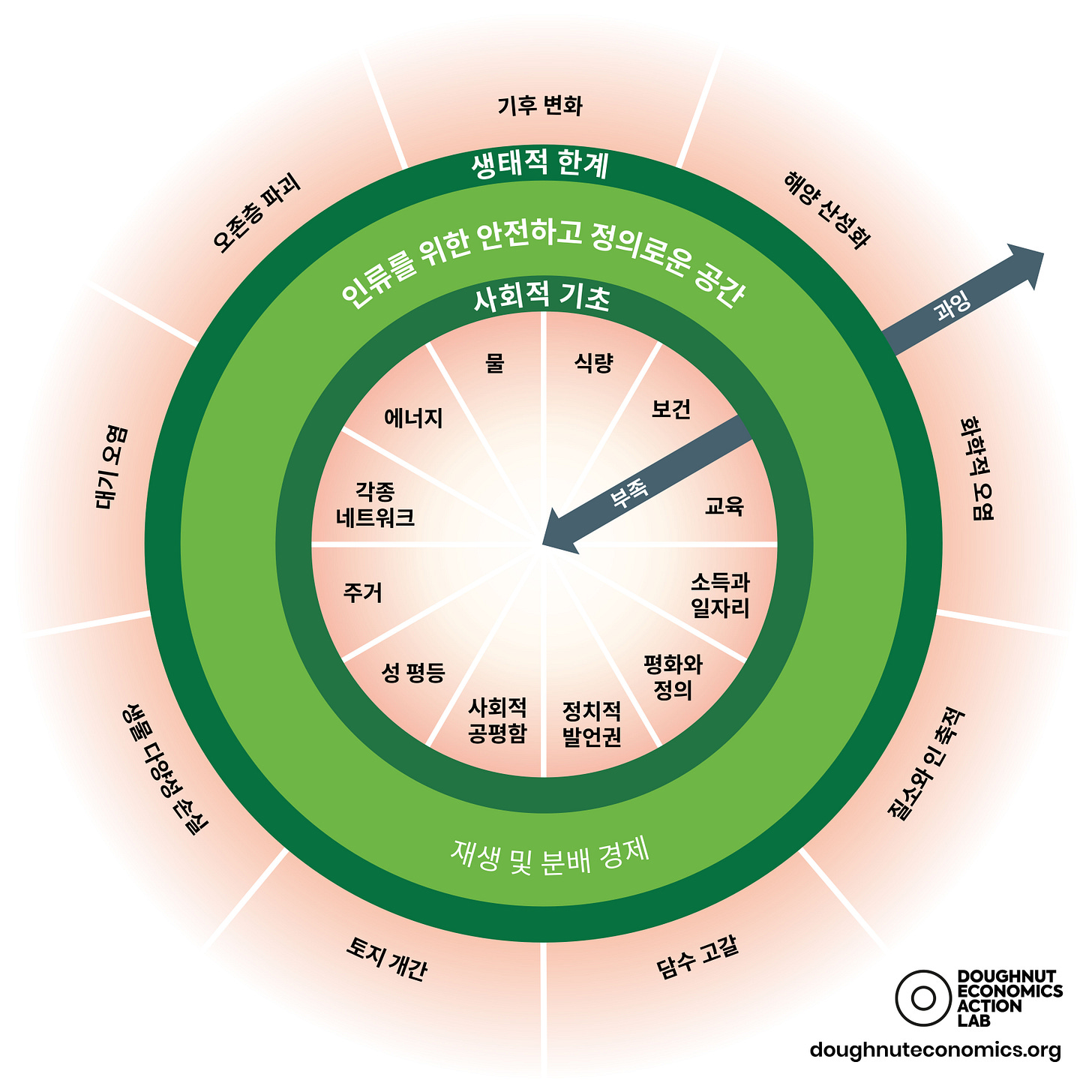 도넛 경제학은 영국의 경제학자 케이트 레이워스(Kate Raworth)가 제안한 대안 경제 모델입니다. 이 모델은 두 가지 주요 원칙을 강조합니다. 첫째, 최소한의 사회적 기초가 충족되어야 한다는 것이고, 둘째, 지구의 생태적 한계를 넘지 않아야 한다는 것입니다. 도넛 모양의 경제 모델은 바로 이 두 가지 원칙을 시각적으로 표현한 것입니다.